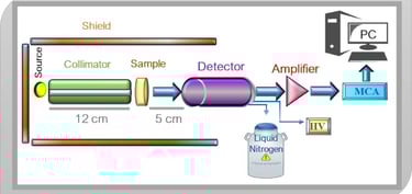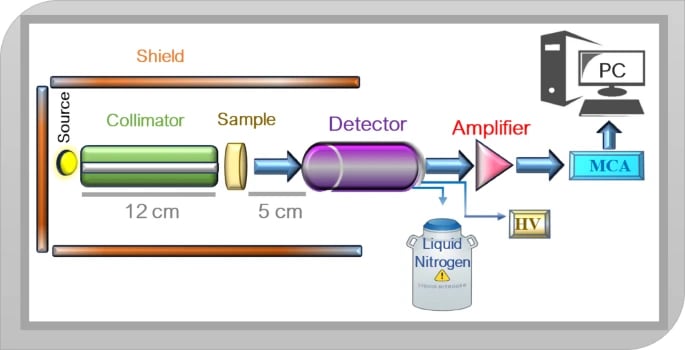 The experimental shielding characteristics of the manufactured glass samples were tested using an HPGe detector39 against the four energy ranges of three sources Am-241, Co-60, and Cs-137. The geometry of the configuration used in this study, shown in Fig. 2, used the narrow beam method. A glass sample was placed as shown in Fig. 2 between a source of specific energy photons and the detector. The transmission intensity after sufficient measured time (to give error less than 1%) can be measured by knowing the area under the photopeak (A), the measuring without the glass absorber at the same time give the initial intensity or (AO). By calculating the thickness of glass (t) as well as the measured values A and AO, The LAC can be estimated by the next formula5,40,41,42,43,44,45,46.