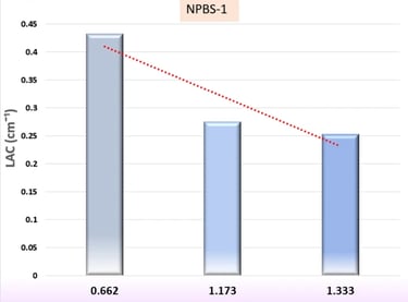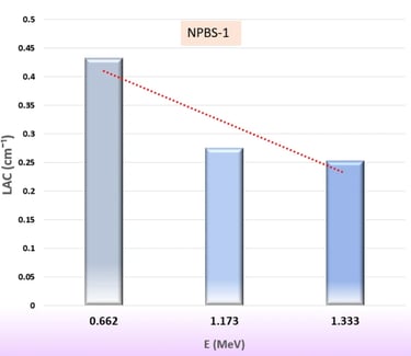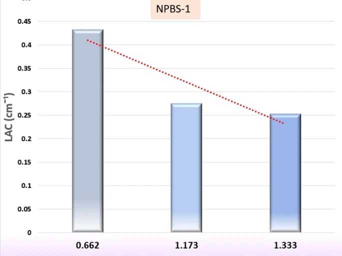 igures 4, 5 and 6, and 7 show the results of a study that determined several shielding parameters to determine the NBPS glasses’ ability to reduce incoming gamma rays. Figure 4 reveals the distinct trend of the LAC results as a function of energy (0.662, 1.173 and 1.333 MeV) and the NPBS glass composition. The LAC value of NPBS-1 dropped approximately 41% to 0.253 cm− 1 at gamma photon energy 1.333 MeV from 0.432 cm− 1 at 0.662 MeV. Furthermore, Fig. 4 illustrates the same trend of reduction that was observed for NPBS-2 (~ 42% decrease, 0.450 to 0.262 cm− 1), NBPS-3 (~ 42% decrease, 0.468 to 0.271 cm− 1) and NPBS-4 (~ 42% decrease, 0.486 to 0.280 cm− 1). The decreasing LAC values are affected mainly by the interactions between gamma photons and the NPBS glasses. At 0.662 MeV, the relatively higher value of LAC shows absorption of stronger gamma photon due to the photoelectric effect (PE) at the lower energies depending on the atomic number (Z). The progressive reduction of LAC values at 1.173 and 1.333 MeV, attributable to the dominance of Compton scattering (CS), a less Z- sensitive interaction mechanism and the cross section isproportional inversely with the gamma photon (σCS α −1)54,55.