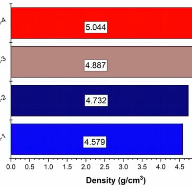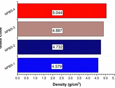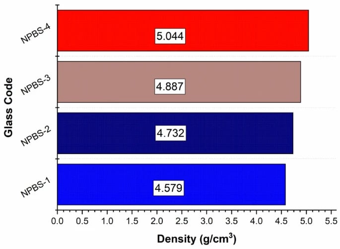 The density of NPBS glass is measured and presented in Fig. 3. The density values of NPBS glass samples are systematically rising, with NPBS-1 having the lowest density (4.579 g/cm3) and NPBS-4 having the highest density (5.044 g/cm3). This trend is primarily due to the increased content of PbO2, which clearly affects the cohesion of the glass structure. The high atomic mass of PbO2 in the composition of NPBS glass enhances the density, while the lattice components are affected by B2O3 and SiO2, which contributes to structural stability. Moreover, sodium oxide (Na2O) acts as a modifier, affecting the glass Lattice and overall density. The interaction of these oxides determines the physical properties of NPBS glass. Higher densities correspond to more compact atomic arrangements, which can enhance the glass’s shielding capabilities against ionizing radiation. The differences observed between NPBS-2 (4.732 g/cm3) and NPBS-3 (4.887 g/cm3) indicate how slight compositional changes affect the density. These findings are advantageous for applications requiring high-density glass materials, such as radiation shielding and optical components.