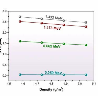 The TVL was also estimated for various applied gamma photon energies, as shown in Fig. 7. Like the same trend of HVL, the TVL values are reducing as the density of NPBS glasses increases from 4.579 to 5.044 g/cm-3. Figure 7 displays also the variation of TVL values with the increasing of the gamma photon energy from 0.059 to 1.333 MeV. At 0.059 MeV, the TVL values in changed from 0.177 cm for NPBS-1 to 0.146 cm for NPBS-4, indicating that the higher capability to attenuate the low gamma photon energies. At the intermediate gamma photon energy 0.662 MeV, the TVL values falls from 5.325 to 4.733 cm for NPBS-1 and NPBS-4, respectively, demonstrating the radiation shielding efficiency of the denser NPBS glasses.Consequently, The TVL values at the higher gamma photon energies such as 1.173 MeV and 1.332 MeV are significantly high owing to the provenance impact of the CS. The values of TVL at 1.333 MeV are 9.094 cm for NPBS-1 and reduced to 8.231 cm for NPBS-4, emphasizing the denser NPBS compositions provide better radiation shielding at high gamma energies. Therefore, the mentioned discussion reinforces the suitability of the NPBS glasses for the radiation shielding, especially in the applications requiring the capability to attenuate the high-energy gamma radiation.