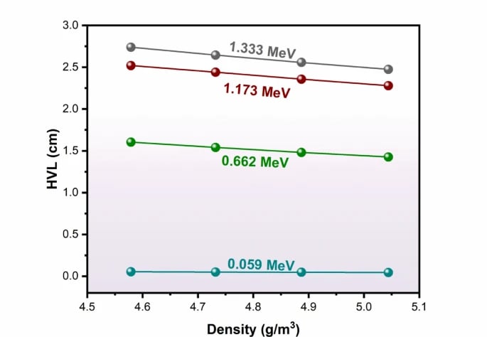 Moreover, the effect LAC with the NPBS chemical composition was studied and presented in Fig. 4. The LAC values increased progressively from NPBS-1 to NPBS-4 across all gamma photon energy levels. At 0.662 MeV, approximately 12.5% enhancement was detected when the LAC values increased from 0.432 cm− 1 (NPBS-1) to 0.486 cm− 1 (NPBS-4). This behavior suggests the NPBS-4 as superior radiation shielding efficiency at the low gamma energies due to the compositional differences like the higher density and the doping of heavy elements (Pb) compared to the NPBS-1.The HVL of NPBS glasses was investigated across the applied gamma photon energies as a function of the density and presented in Fig. 5. The values of HVL exhibit a diminishing trend with the elevating NPBS glass density, confirming the glass composition with high density is a superior gamma shielding efficiency. According to Fig. 5, the higher value of HVL 0.053 cm (NPBS-1) is comparable to the lower value 0.044 cm (NPBS-4) which was detected at the low gamma photon energy 0.059 MeV, revealing the strong attenuation attributable to the photoelectric absorption. In contrast, the increasing gamma photon energy leads to an increase in the HVL values across all NPBS glass compositions. For example, the highest values of HVL 2.740, 2.646, 2.558 and 2.476 cm for NPBS-1 to NPBS-4, respectively, were measured at the gamma photon energy 1.333 MeV. Moreover, the remarked trend indicates that the doping lead oxide (PbO2) improves the radiation shielding features of the studied NPBS glasses at the lower and intermediate range of gamma energies. Figure 5 displays also the progressive trend of decreasing in HVL values with the variation of density from 4.579 g/cm− 3 (NPBS-1) to 5.044 g/cm− 3 (NPBS-4) proves the conclusion that NPBS-4 suggests that the most effective protection performance.Figure 6 presents the variation of TF% at 2 cm thickness of four NPBS glasses with the increasing of gamma photon energy from 0.059 to 1.332 MeV. The results show the TF% diminishes as the NPBS glass’s density increase, confirming their enhanced attenuation capability. The TF values of NPBS glasses are nearly negligible at the low gamma energy 0.059 MeV, illustrating the strong photon absorption. Subsequently, the TF values range from 42.11 to 37.80% for NPBS-1 and NPBS-4, respectively, at 0.662 MeV, providing the increase of shielding efficiency with the increasing density. At higher gamma photon energies 1.173 and 1.333 MeV, the TF values remain relatively high due to the increased transmission of gamma photon through NPBS glasses. The TF values are 60.27% for NPBS-1 and reduced to 57.15% for NPBS-4, providing that although the lower effective of gamma photon attenuation at high gamma energies, the glass with the higher density still offer enhanced radiation shielding.