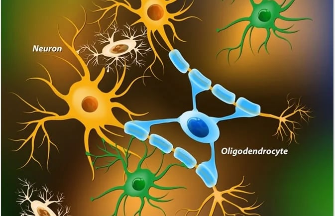 These cells wrap axons in myelin, a fatty coating that acts like electrical insulation, speeding up nerve impulses. Without myelin, communication in the brain would slow to a crawl — as seen in diseases like multiple sclerosis.